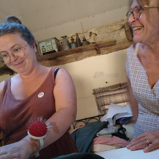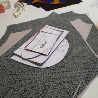 Je crois que le plus délicat fut la pose des fermetures des poches. Les explications étaient claires mais cela faisait très peur de couper le tissu au milieu de la fermeture ! Mais, ça marche ! J'apprends à obéir aux consignes au lieu de tout faire "au pif" et deviens une pro du bord côtes. On a bien ri parfois et on a été aussi bien concentrées. Merci Gilles pour l'astuce des poids à poser sur les tissus pour en faciliter la découpe ! Les vieux fers à repasser ont bien trouvé leur utilité !