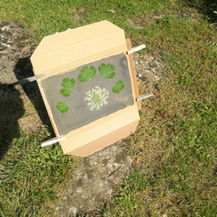 Tout est très bien expliqué. Première étape, préparer le mélange et l'appliquer sur un support (papier, carton, tissu…). Au départ, le papier est jaune/vert. Le mettre à l'abri de la lumière et attendre que tout soit bien sec puis choisir les objets que l'on souhaite obtenir sur l'image. On les intercale entre un support en bois et une plaque de verre. Il n'y a plus qu'à les mettre au soleil puis rincer quand l'impression est terminée, c'est à dire quand les bleus se sont bien révélés.